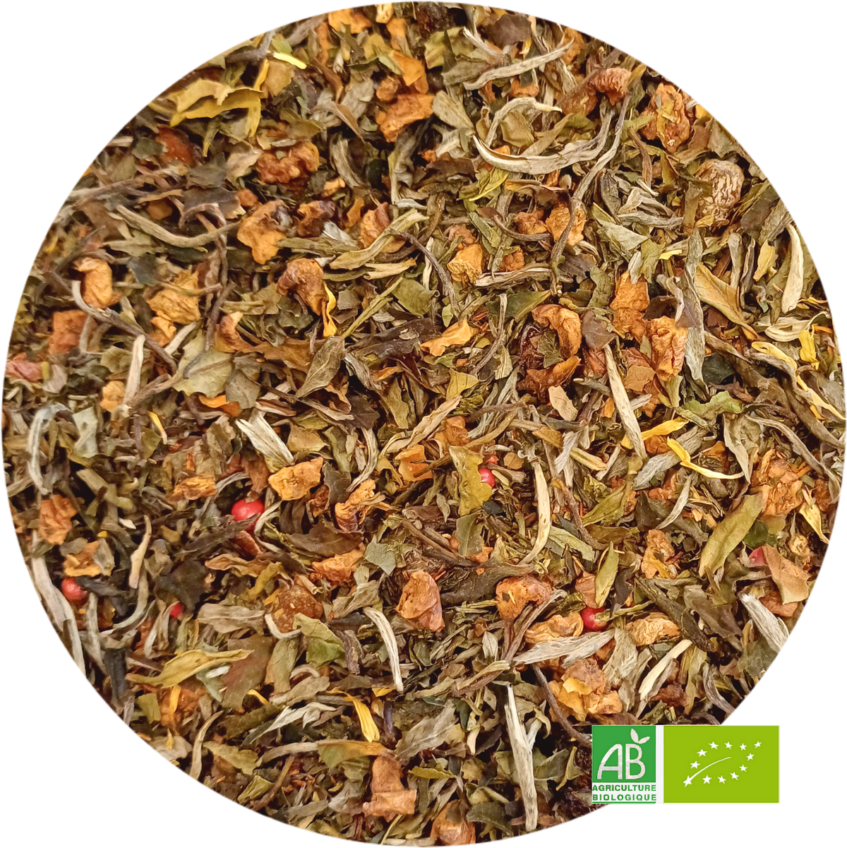 Paï Mu Tan, Chun Mee et un peu de Rooibos donc très pauvre en théine. Parfumé intensément à la pêche et abricot.